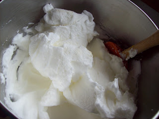 At the same time I had my egg whites and a pinch of salt whipping in the mixer. They’re supposed to be whipped until stiff but not dry- I’m not sure if I crossed over to dry or not, I read that in Joy of Cooking
